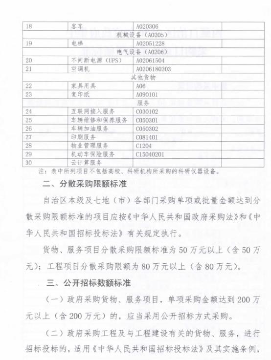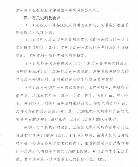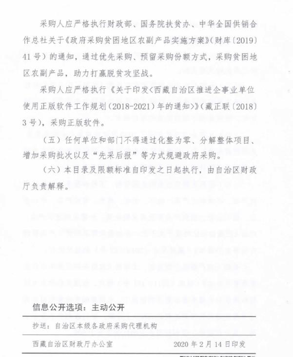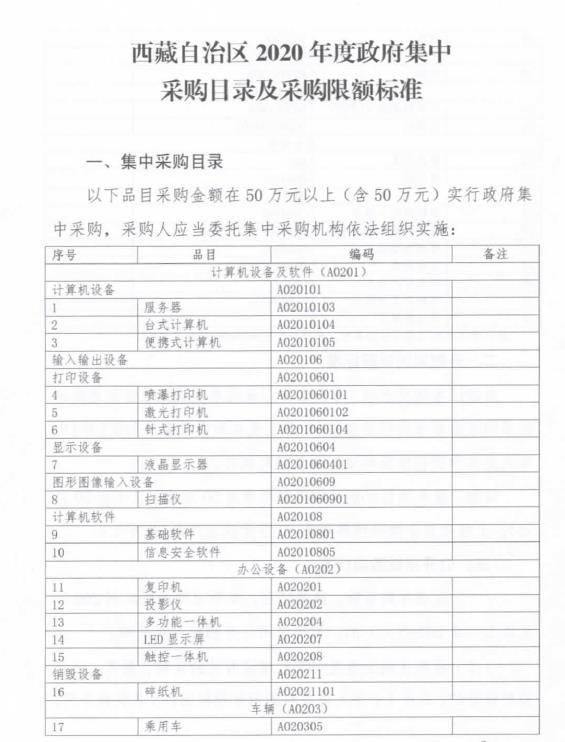 西藏自治区2020年度政府集中采购目录及采购限额标准