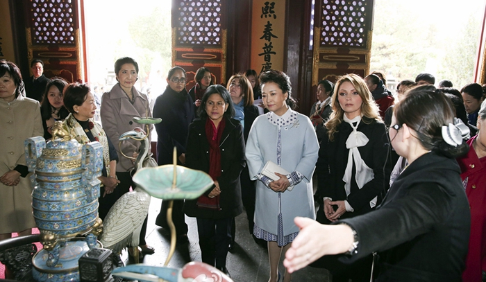 颐和园水木自亲殿内,彭丽媛与出席2014年APEC领导人非正式会议的部分经济体领导人或代表的夫人,观看了景泰蓝、花丝镶嵌、雕漆等非物质文化遗产展示。彭丽媛请夫人们体验景泰蓝的制作流程,尝试着为景泰蓝花瓶点蓝。夫人们纷纷惊叹景泰蓝工艺的精致和繁复。