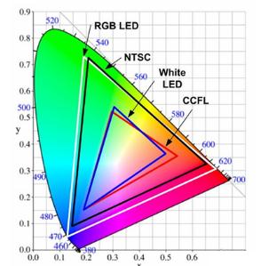 6、色域:色域(Color Gamut),就是指某种设备所能表达的颜色数量所构成的范围区域,色域覆盖率用占NTSC范围的百分比表示,即完全达到NTSC区域等于100%NTSC色域。要求LED显示屏的色域等于NTSC区域。