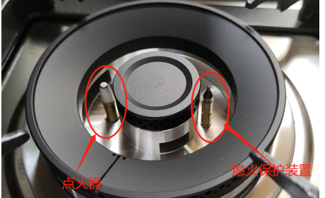 5.选择有熄火保护装置的灶具。对灶具有无熄火保护装置的鉴别:熄火保护装置一般为钢质感应针,一般安装在靠近小火盖火焰的位置,与脉冲点火器(白色)隔火盖相对。