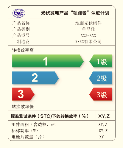 在产品选型时,选择和使用高品质光伏设备对保障电站安全、提升行业质量管理水平、降低财务风险,促进金融服务有重要作用。CQC开展的“领跑者”认证,通过高标准、严要求、实施第三方认证为项目业主单位遴选先进指标产品提供了技术保障。“领跑者”认证针对项目业主关注的转换效率、环境适应性、耐久性、典型环境下的发电能力构建了分级指标体系,参考的标准包括CQC3309-2014《光伏组件转换效率和户外实证测试方法》、CQC3325-2016《地面用晶体硅双玻光伏组件性能评价技术规范》、CQC1619-2018《双面光伏组件电流-电压特性测试方法》等。如光伏组件和光伏逆变器的发电效率指标分为3级,如图4所示,以“1级”代表最高效,为“平价先锋”产品,“2级”代表满足行业先进技术指标要求,为“领跑者”产品,“3级”代表最低效,只满足准入要求。针对光伏逆变器的应用环境特点,依据CQC3318-2015《光伏逆变器特定环境技术要求》,针对特定应用环境下的低温工作、高温工作、交变湿热、振动、冲击、盐雾多重环境综合影响,设定了六类不同严苛程度的特定环境测试序列。“领跑者”认证是一个拔高的认证,业主单位可根据光伏产品的使用场景、投资模型选取相应的“领跑者”产品。