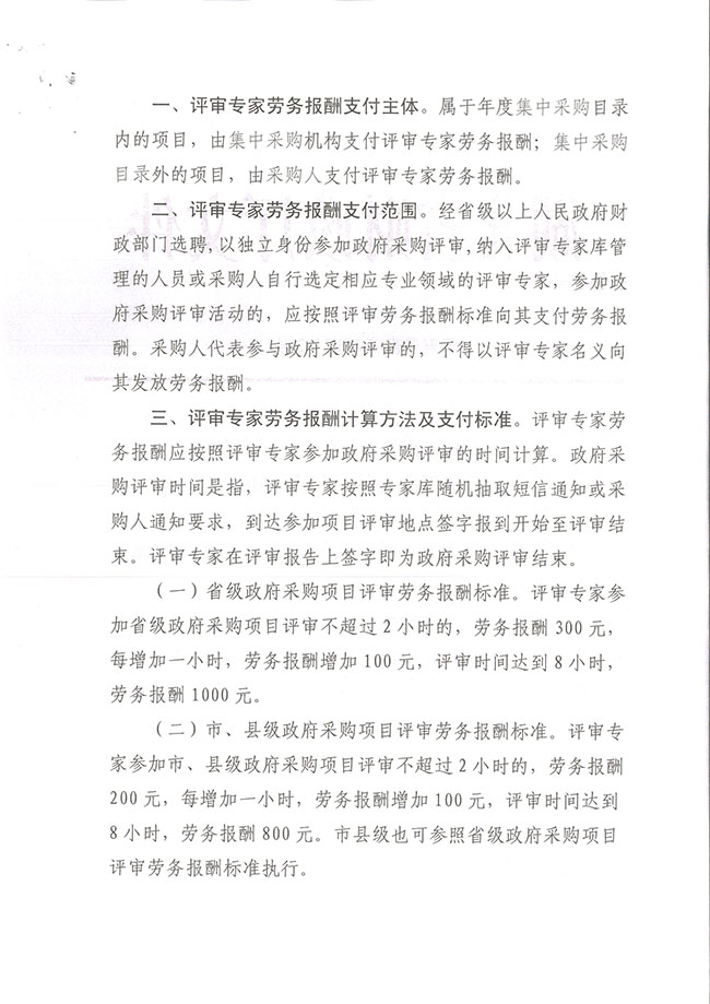 (一)省级政府采购项目评审劳务报酬标准。评审专家参加省级政府采购项目评审不超过2小时的,劳务报酬300元,每增加一小时,劳务报酬增加100元,评审时间达到8小时,劳务报酬1000元。
